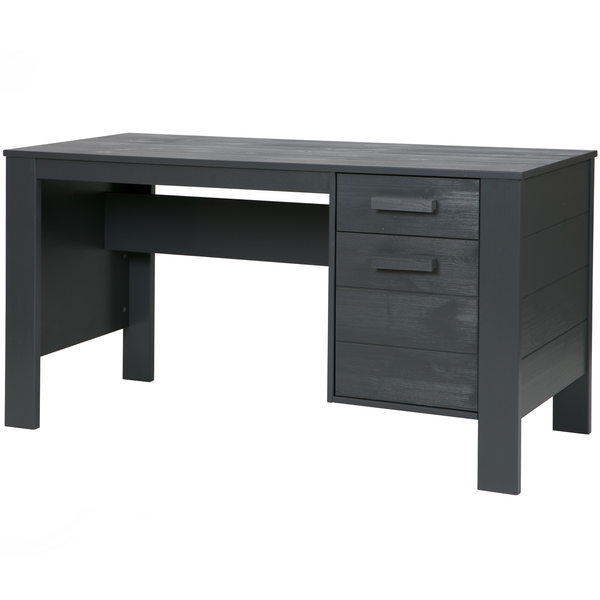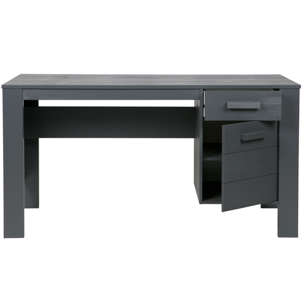 Are you looking for a desk with storage options? This sturdy Dennis desk with built-in drawer and cabinet lacquered in steel gray is robust and ensures a tidy worktop! The desk is made of pine wood that comes from an FSC-certified supplier and has a brushed finish. The grains and knots are accentuated by the brushing, giving the wood a weathered look. This treatment can make irregularities, small cracks and knots extra visible. These are characteristics of weathered wood. Each copy is therefore unique!