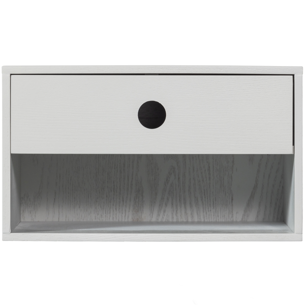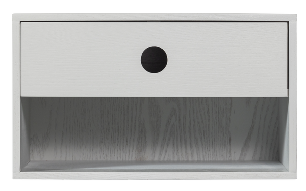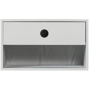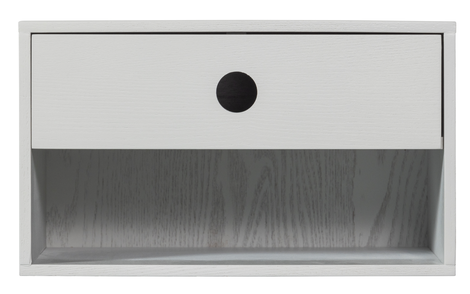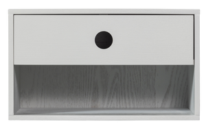 Nancy has a height of 20 cm, a width of 34 cm and a depth of 30 cm. The drawer front is 32 cm wide and 9 cm high. The open compartment has a size of H 9 x W 32 x D 28 cm. Nancy is equipped with a hanging system: Slat with beveled edge, H 4 x W 31.5 x D 1.5 cm, including 2+1 screws and 2+1 universal wall plugs. Nancy has a load capacity of 5kg per drawer/compartment.