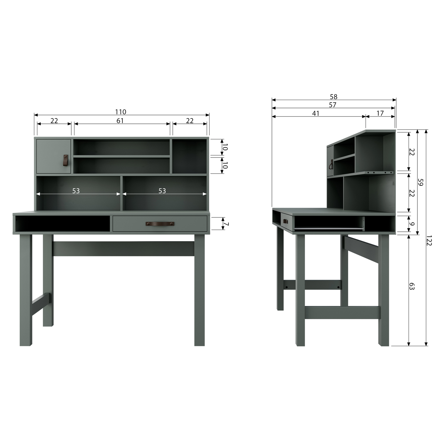 The Stage desk has six storage compartments, each with a height of 22 cm, except for the middle compartment at the top. This is divided into 2 compartments of 10 cm. The compartment at the top left has a door with a brown leather handle. Under the worktop (with a depth of 41 cm) there are two storage compartments, 1 with a drawer with a brown leather handle. These compartments are 7 cm high. The height of the worktop is 63 cm. Keep this in mind when purchasing an office chair.