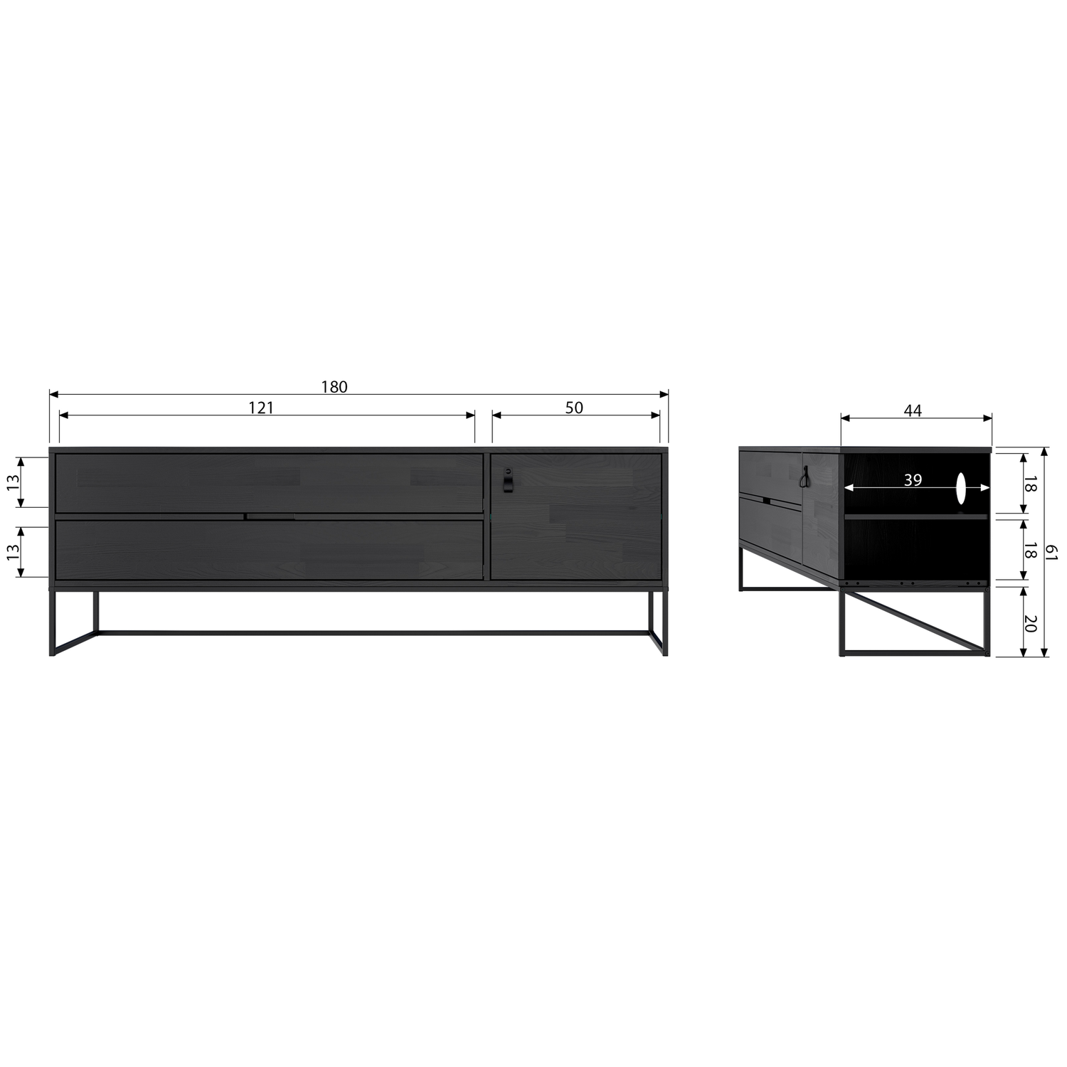Le meuble TV de 120 cm possède deux tiroirs de 61 cm de large et 13 cm de haut. Le meuble de droite est doté d'une étagère (en aggloméré) et d'une porte (H 37 x L 50 cm) avec poignée en cuir. Le meuble TV de 180 cm de large possède deux tiroirs de 121 cm de large et 13 cm de haut. Le meuble de droite est doté d'une étagère (en aggloméré) et d'une porte (H 41 x L 50 cm) avec poignée en cuir. Ce meuble est doté d'un trou pour les câbles, les fils électriques, etc. Très pratique !