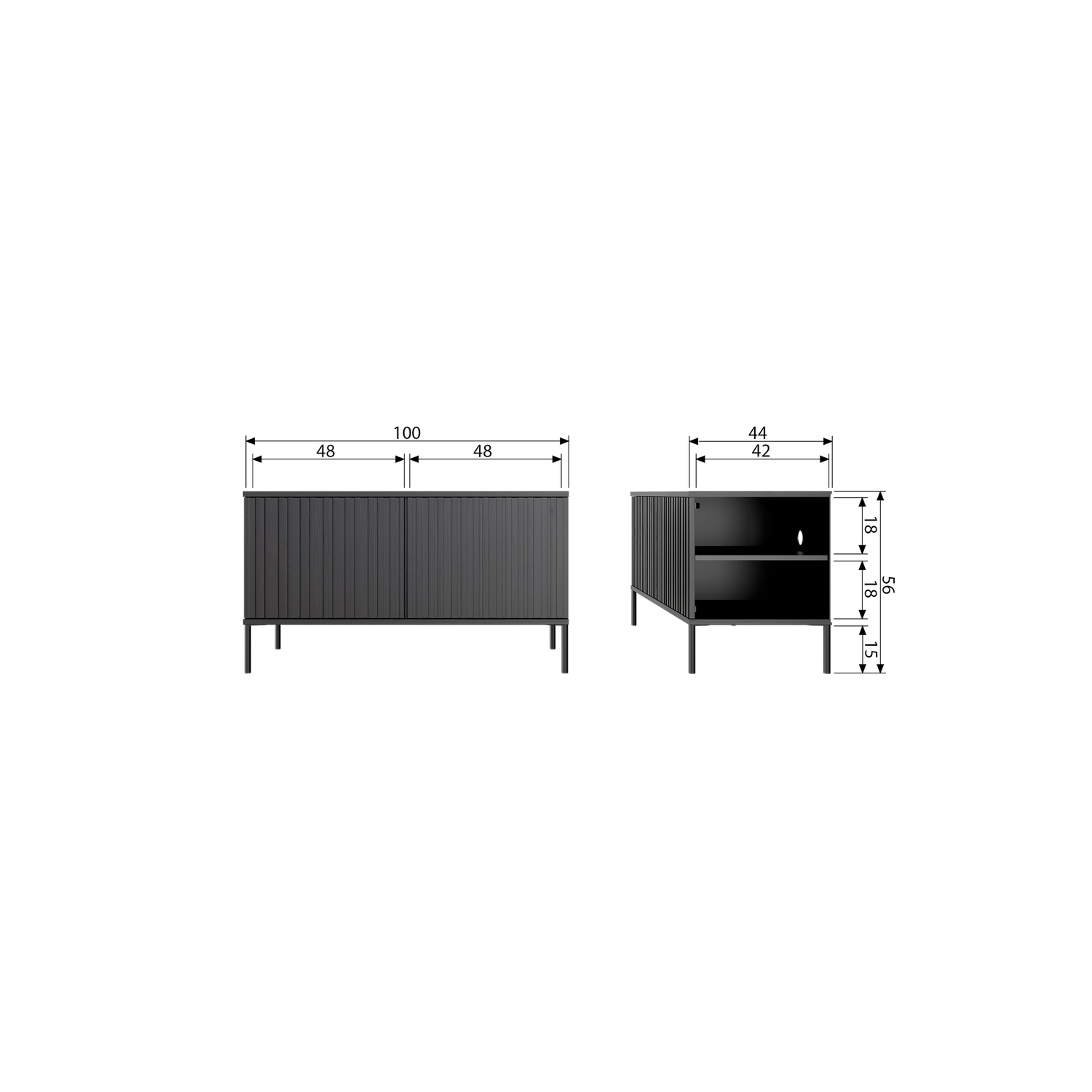Les deux meubles TV New Gravure mesurent 56 cm de haut et 44 cm de profondeur. Toutes les portes mesurent 37 cm de haut, 50 cm de large et 2 cm d'épaisseur. Une étagère se trouve derrière chaque porte. L'intérieur est en aggloméré gris brume et les pieds (hauteur 15 cm) sont en métal avec revêtement noir.