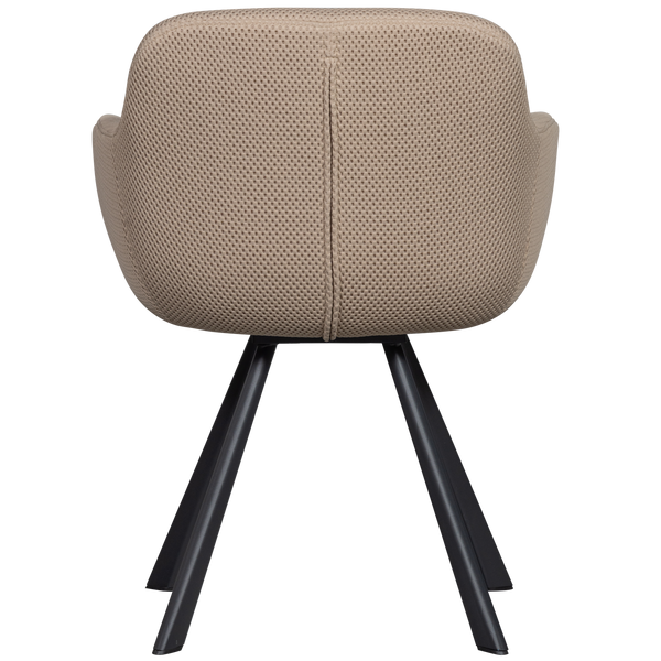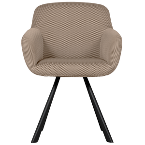 De Juno eetkamerstoel is voorzien van metalen poten met een matte zwarte poedercoating. De zitting is geconstrueerd met een stalen frame en multiplex, bekleed met polyurethaan schuim. De bekleding van de zitting bestaat uit een Wave gebreide mesh stof, die de stoel uniek maakt. Deze mesh stof geeft een opvallend 3D-effect en heeft een goede kwaliteit. Met een samenstelling van 100% polyester en een Martindale van 100.000, is de stof uiterst duurzaam. De compact geweven backing zorgt ervoor dat het grafische patroon te allen tijde in vorm blijft.