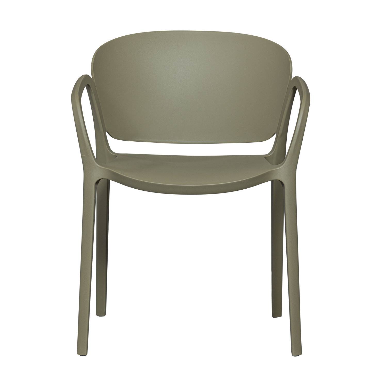 De tuinstoel is gemaakt van kunststof dat zowel lichtgewicht als weerbestendig is. Dit materiaal houdt zijn kleur lang mooi en is bestand tegen verschillende weersomstandigheden. Het kunststof voelt prettig aan en warmt niet op in de zon.