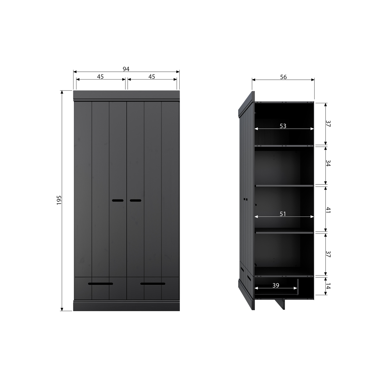 Nu ook in de kleur zwart. Uit de serie CONNECT; een stoere basic 2-deurs kledingkast met strakke sokkel en koof gecombineerd strokendeuren met sleufgrepen en 2 lades voorzien van solide metalen ladegeleiders.