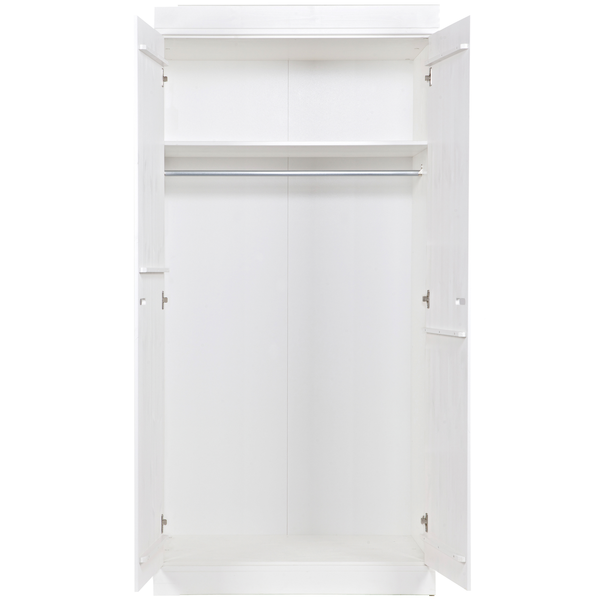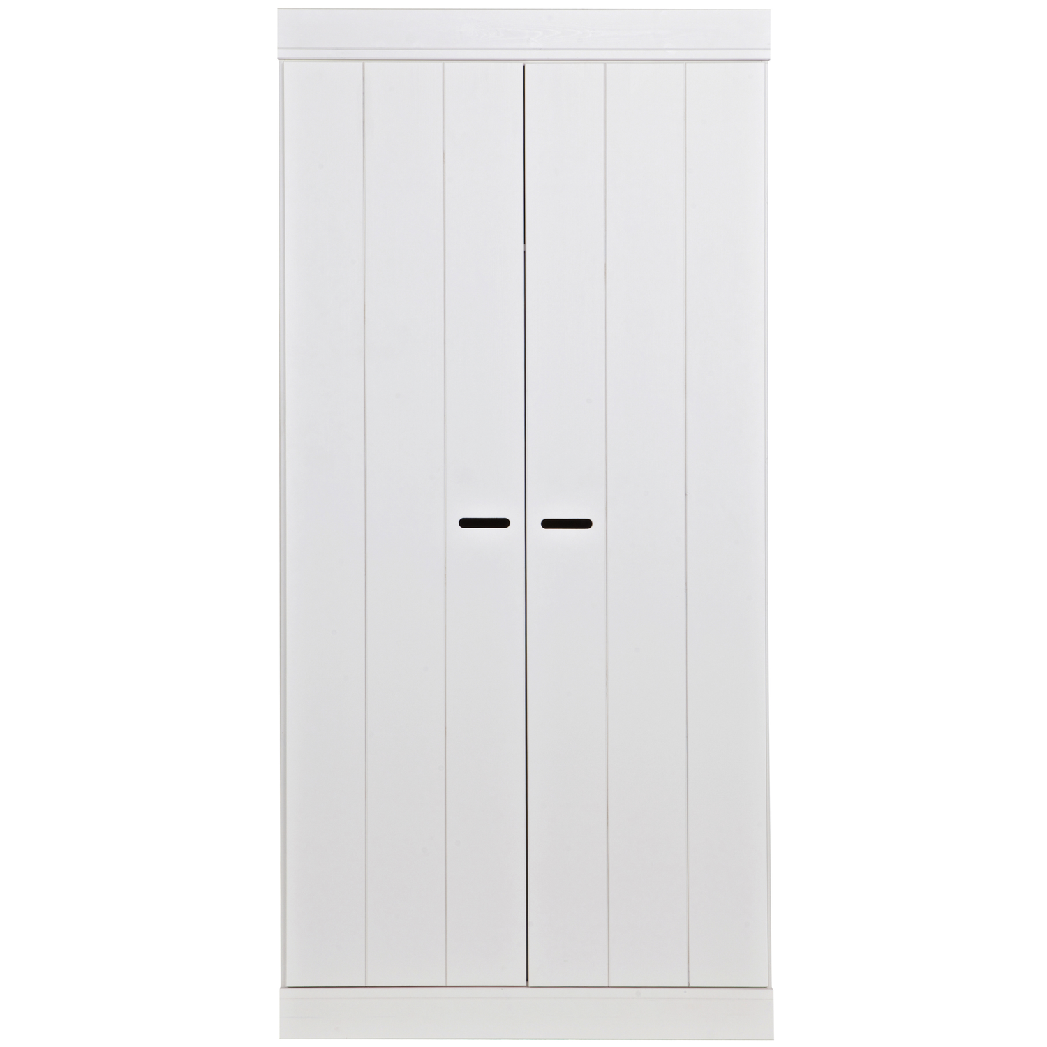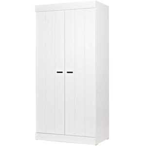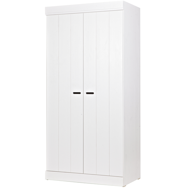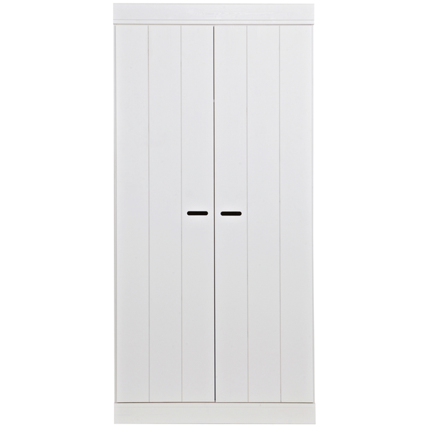 Uit de serie CONNECT; een stoere basic 2-deurs kledingkast met strakke sokkel en koof gecombineerd met strokendeuren met sleufgrepen. Met de CONNECT kasten kun je je eigen kastenwand bouwen! De romp van de CONNECT kledingkast is gemaakt van massief grenenhout dat afkomstig is van een FSC gecertificeerde leverancier. De binnenzijde is voorzien van gemêlamineerde legplanken, praktisch met schoonmaken! De kasten zijn in de kleur wit gespoten, maar je schildert ze zelf binnen een handomdraai ook in een andere kleur (gebruik in dat geval watergedragen lak).