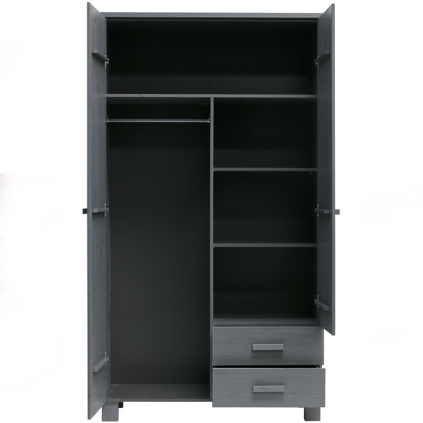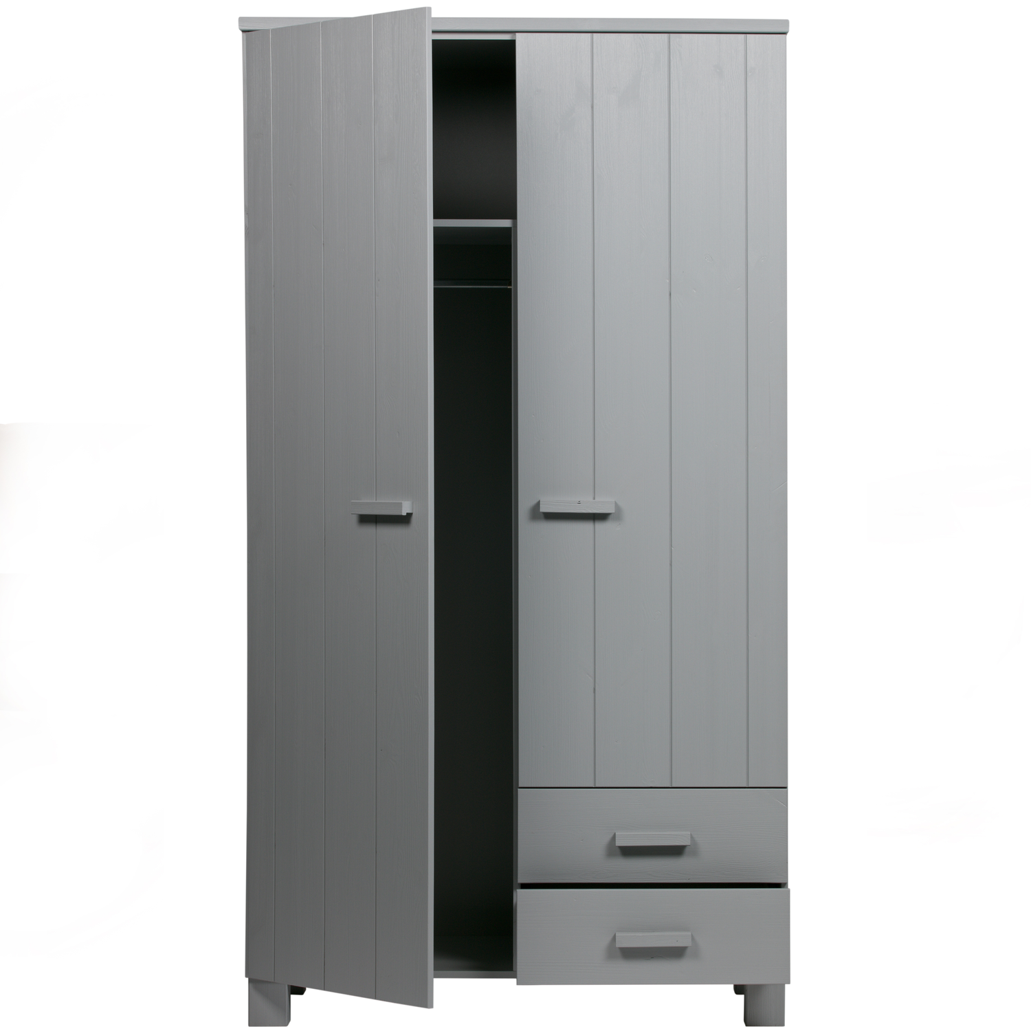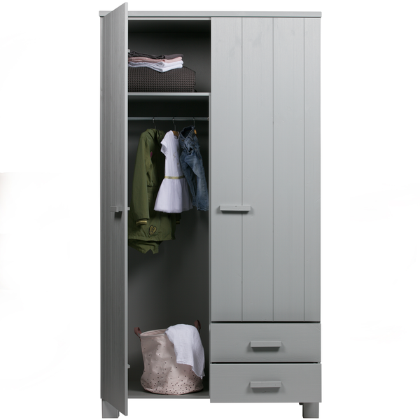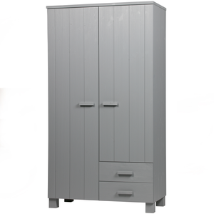 De populaire kast Dennis is er nu ook met handige lades. De hang/leg kast Dennis is stevig en stoer, gemaakt van massief grenen hout met een geborstelde afwerking en gespoten in de kleur betongrijs. De deuren van de kast hebben een verticale v-groef belijning. Het interieur van de kast is van melamine en bestaat uit één brede legplank bovenin en daaronder links een gedeelde roede en rechts drie gedeelde legplanken en een ladeblok met 2 lades.