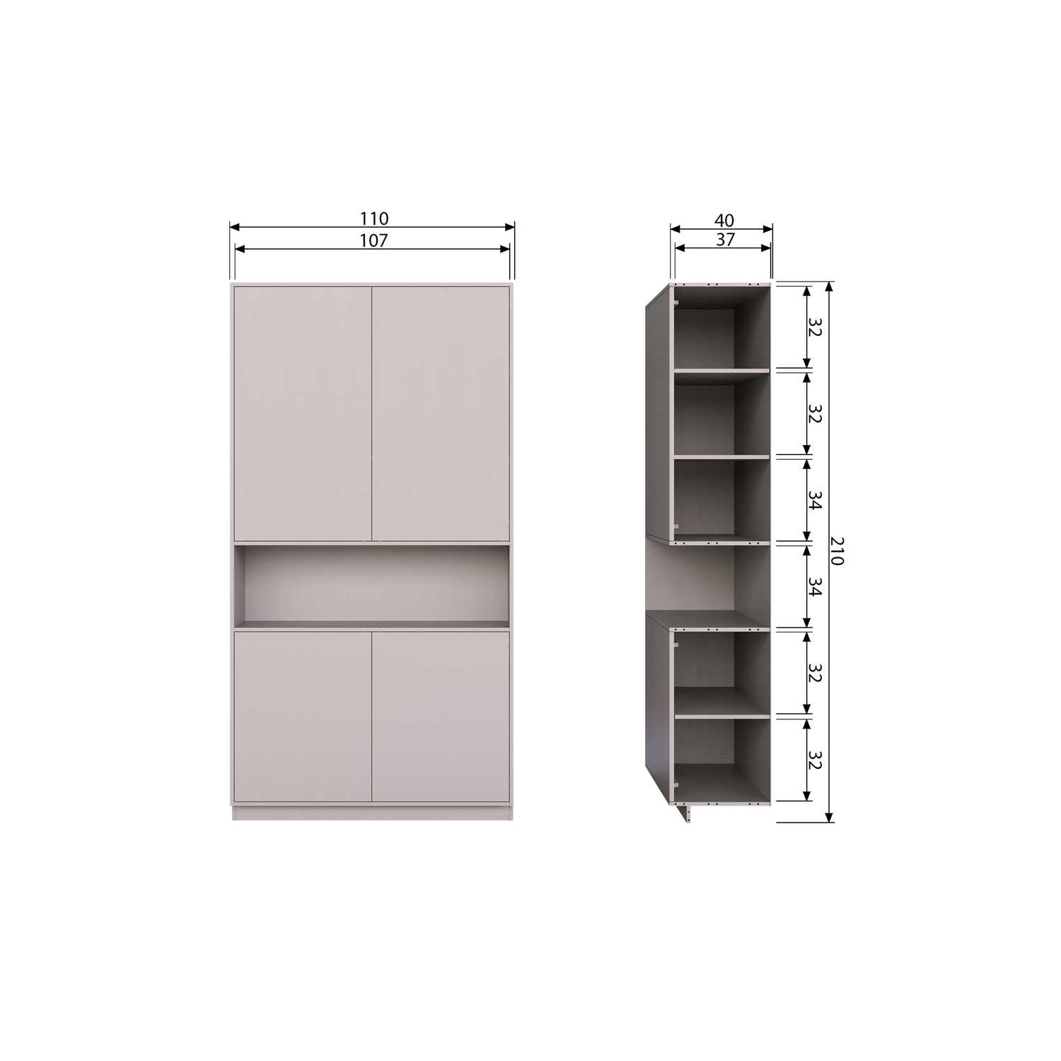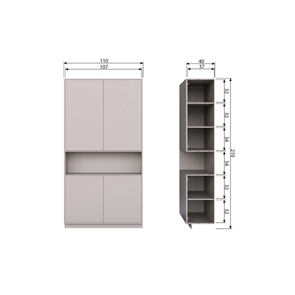 De bovenste twee deuren van de Finca buffetkast dekken drie handige opbergvakken af. Hieronder bevindt zich een open vak voor het presenteren van jouw mooiste woondecoratie. De twee onderste deuren houden nog eens twee ruime opbergruimten uit het zicht. Vier van de zes vakken hebben ieder een hoogte van 32 cm en twee vakken (in het midden) hebben een hoogte van 34 cm. Alle zes de vakken hebben een breedte van 108 cm en een diepte van 37 cm. Iedere plank heeft een draagkracht van maximaal 10 kg wanneer het gewicht gelijkwaardig verspreid is.