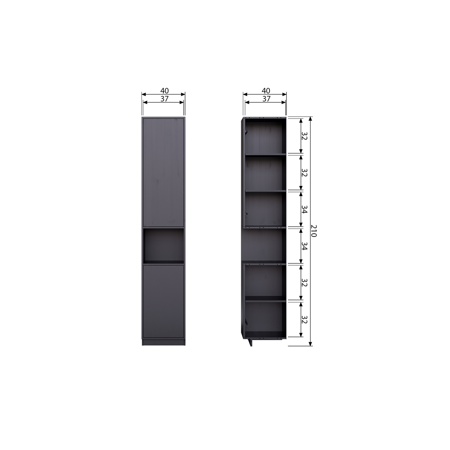 De Finca buffet-/opbergkast 40 cm is de smalle variant. De bovenste deur dekt drie handige opbergvakken af. Hieronder bevindt zich een open vak voor het presenteren van jouw mooiste woondecoratie. Het onderste deurtje houdt nog eens twee ruime opbergruimten uit het zicht. Vier van de zes vakken hebben ieder een hoogte van 32 cm en twee vakken (in het midden) hebben een hoogte van 34 cm. Alle zes de vakken hebben een breedte van 38 cm en een diepte van 37 cm.