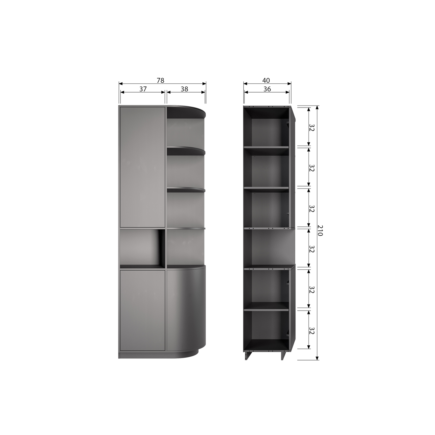 De Finca opbergkast met rond element is een waar pronkstuk in de woonruimte. De open vakken zijn gelijkmatig ingedeeld voor het presenteren van jouw mooiste woondecoratie. De twee deuren houden nog eens een ruime opbergruimte uit het zicht. De vakken hebben een hoogte van 32 cm en een diepte van 37 cm. De onderrand van de opbergkast laat 7 cm ruimte over aan de voorzijde, hierdoor lijkt het meubel te zweven. Iedere plank heeft een draagkracht van maximaal 10 kg wanneer het gewicht gelijkwaardig verspreid is.
