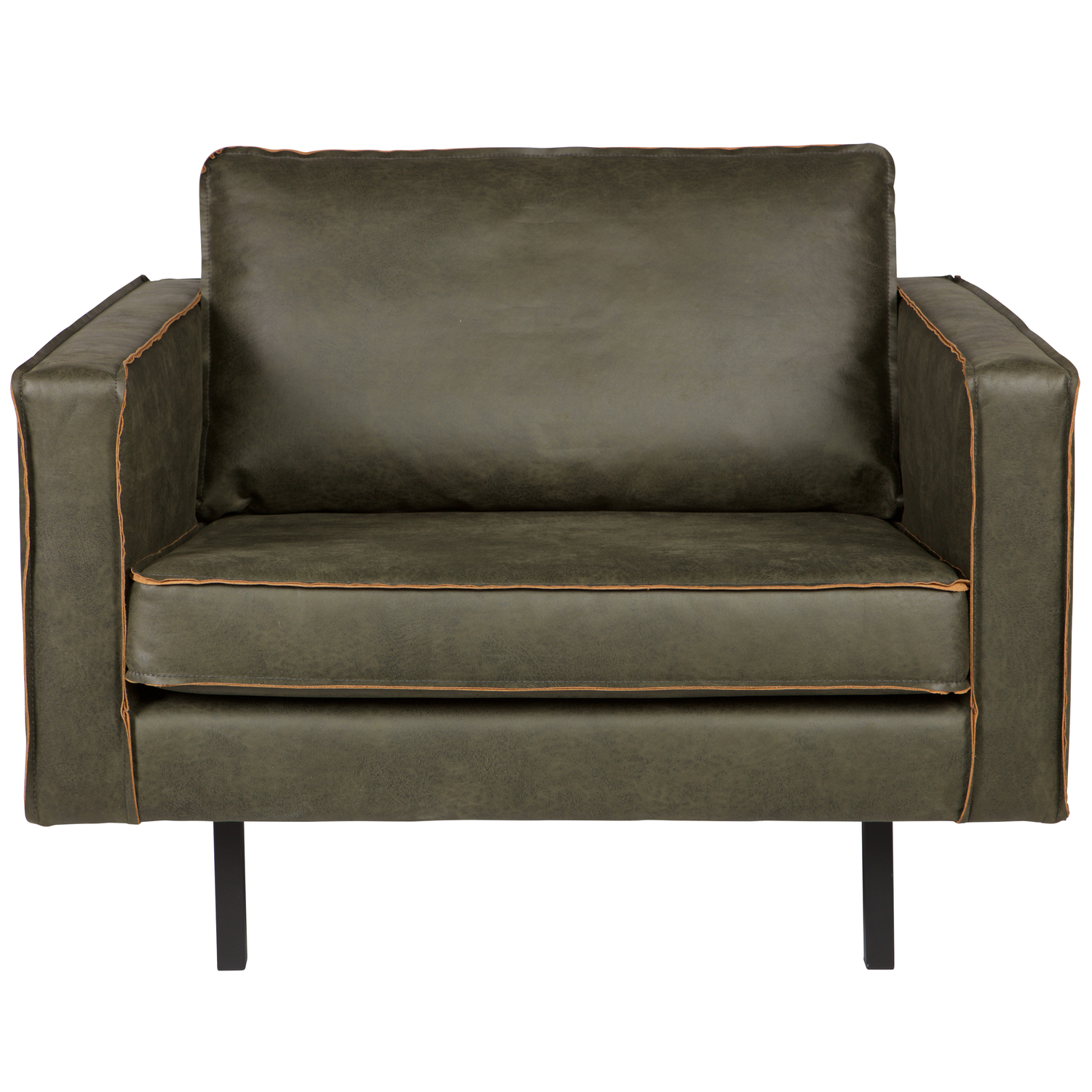 De zitmeubelserie Rodeo van het merk WOOOD is modern, stoer en eigentijds. Deze 1,5-zits fauteuil/loveseat is royaal en beschikt over een stoere stof Recycle leer. Door het slanke frame en losse kussens toont de fauteuil subtiel in de living.